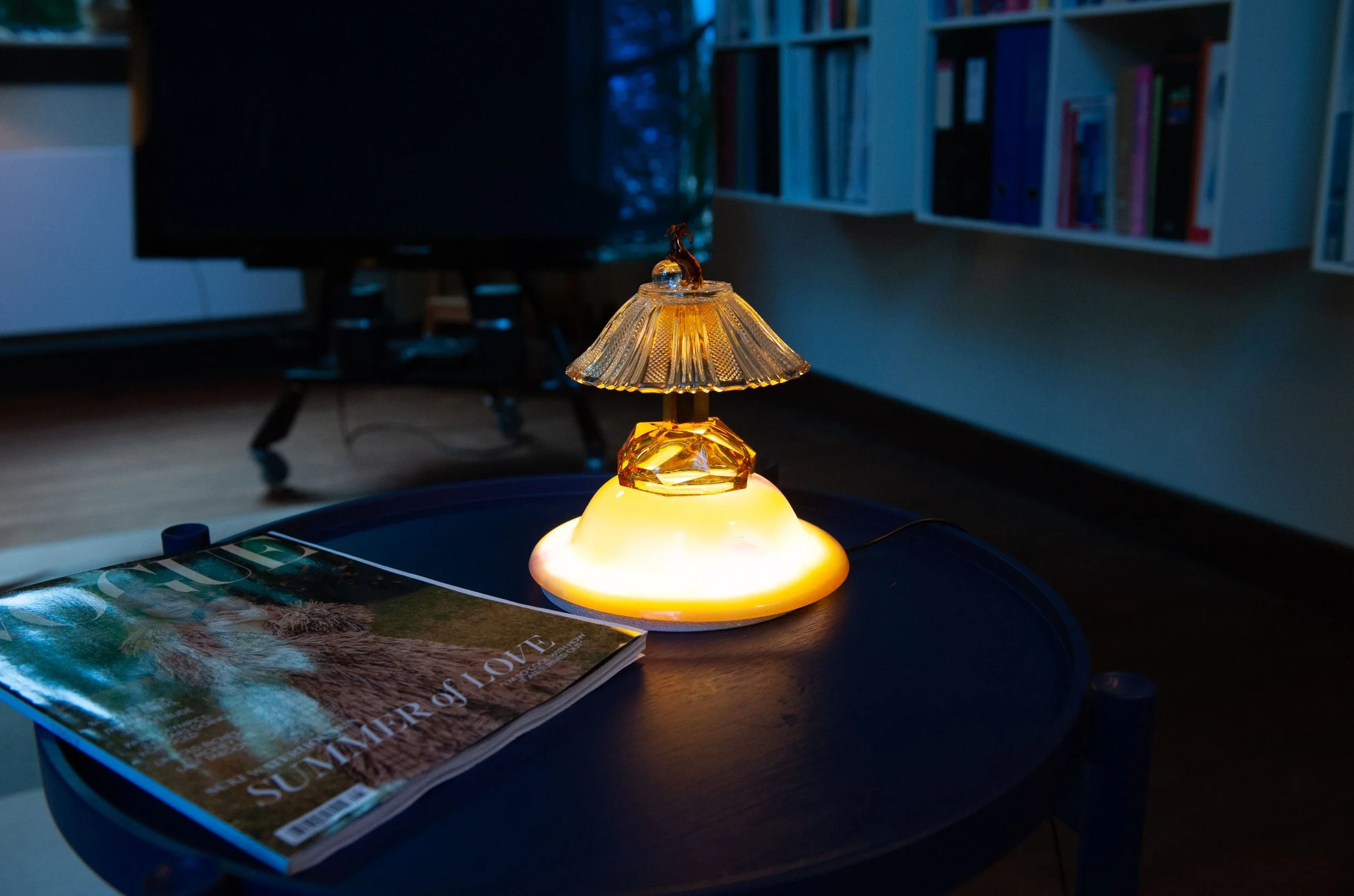 The combined shapes and the integrated lighting solution bring the sculpture to life, casting a warm glow that highlights its intricate details and charming presence.